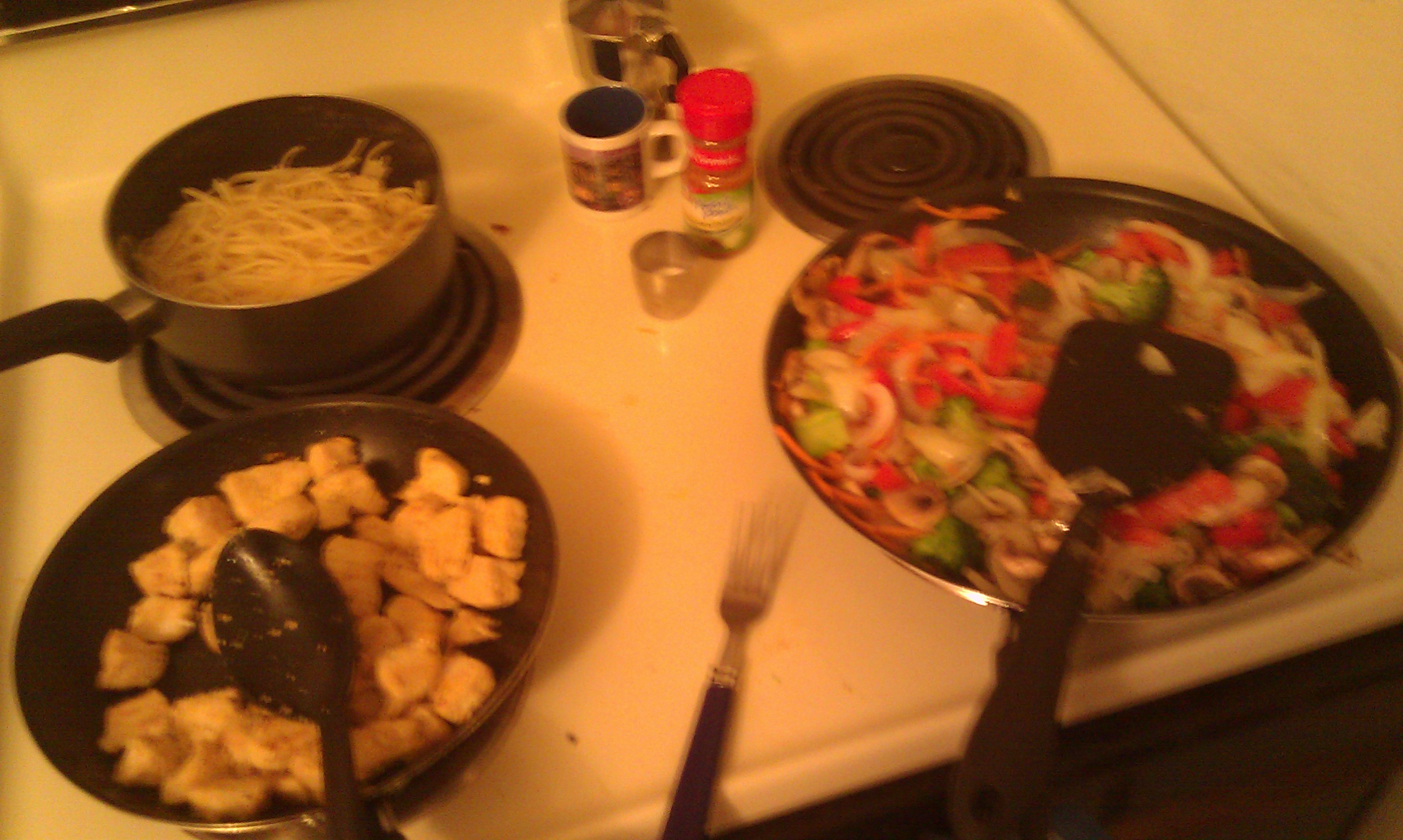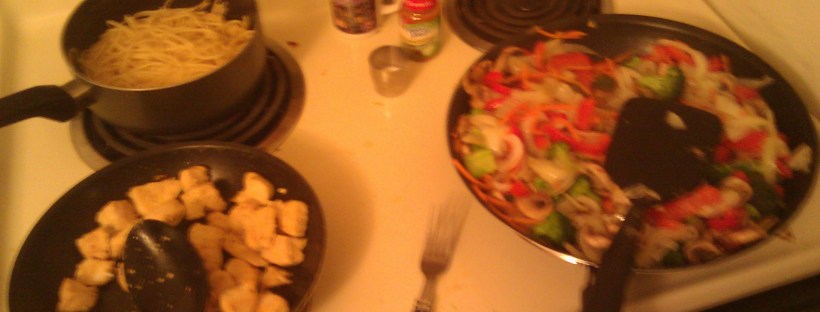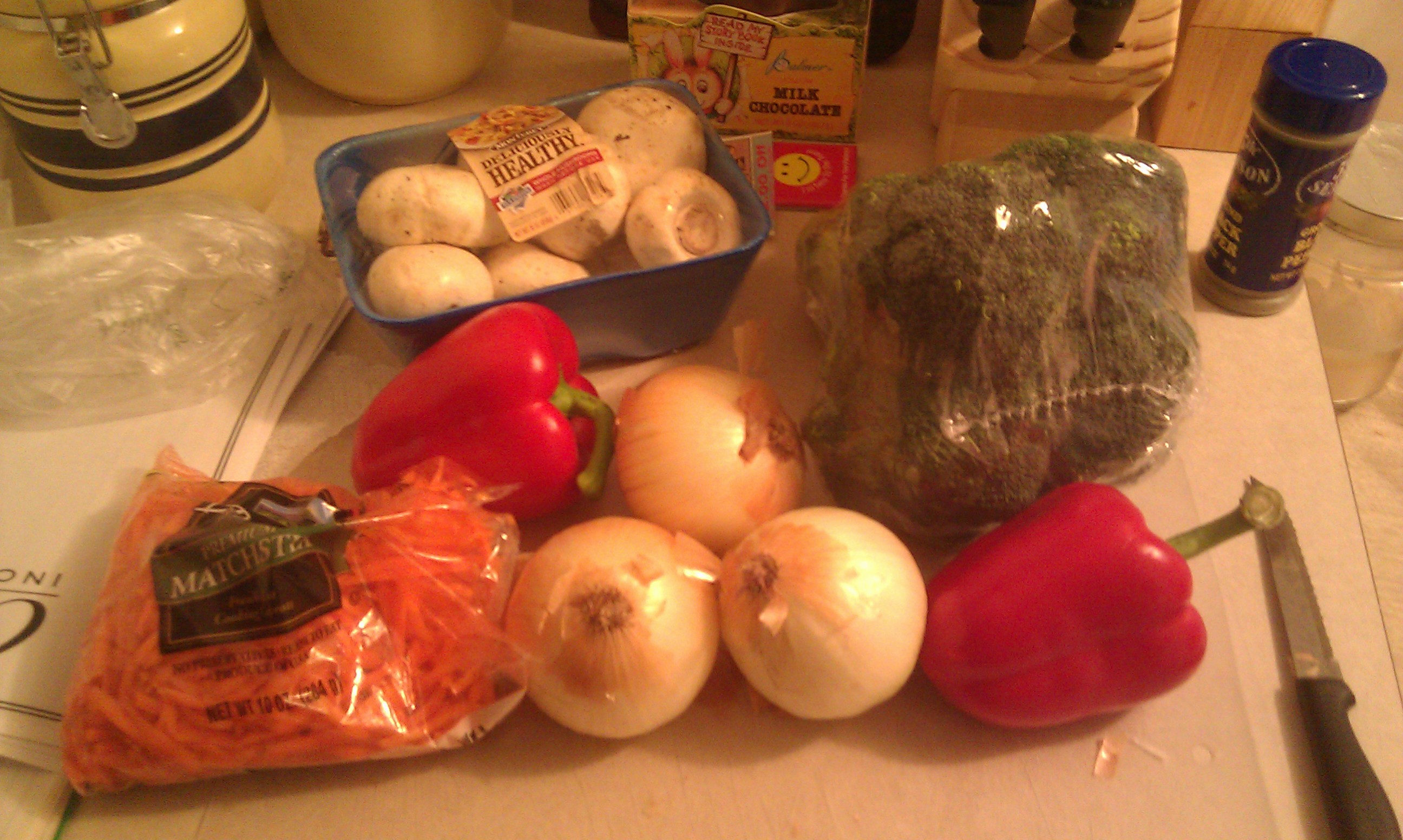 After reading this infographic I thought I would go ahead and try it myself, so I went out and bought the basics for stir fry (broccoli, red peppers, carrots, yellow onions, mushrooms, and a couple pounds of chicken). While I’m ashamed to admit that I purchased all of these things at the Little Falls Wal-Mart, which may throw off the calculations a bit, it came to ~$16.60.