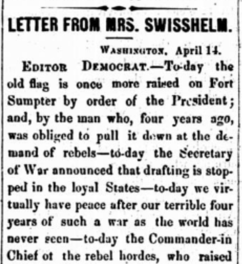 A week later The St. Cloud Democrat published a two-part letter from Jane Grey Swisshelm, an early supporter of Lincoln and one of the state’s most vocal abolitionists. Recording what she saw while in Washington, D.C., her correspondence is fascinating in that, written days apart, the two-halves capture the emotional shift that must have shaken so many. For example, the first is dated April 14, only hours before the assassination, and in it she observes the raised flags and “virtual peace” taking hold in the country: “[O]n this favored day the sun shines gloriously, after a long season of clouds and rain.” But three days later the storm returned: