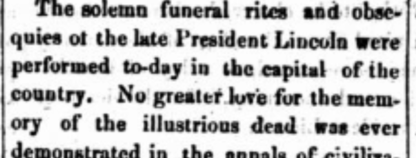 This month marks the 150th anniversary of President Lincoln's assassination. Given the historical distance, though, it's hard for us to really appreciate how traumatic this event was -- especially when, in the days preceding it, there was so much to celebrate. On April 9, 1865, Confederate General Robert E. Lee surrendered at Appomattox, effectively ending the Civil War. But ten days later, the colors of victory faded black as the president's hearse moved solemnly through the streets of Washington. The St. Cloud Democrat (Minnesota: April 27, 1865) ran an account of the three-mile-long procession, which I've reprinted below. As you read it, imagine for a moment what it must have been like watching the carriages move past. Though the war was over, tremulous times lied ahead. The reconstruction of a nation began with a tomb for its moral compass.